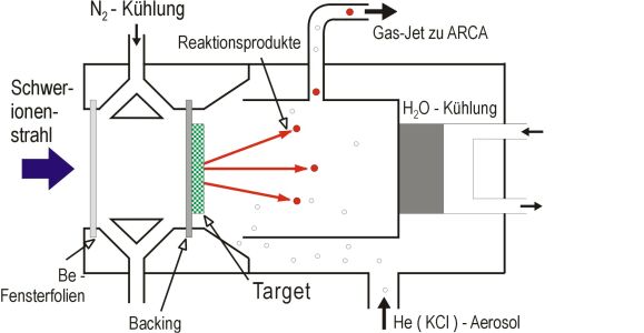 Die für die Experimente verwendete Rückstoßkammer hat einen Außendurchmesser von 177 mm und eine Länge von 256 mm. Das Innenvolumen, das vom Gasjet durchspült wird, beträgt aber nur 98 mL. Die mit dem Schwerionenstrahl gebildeten Rückstoßatome werden in dem Gasraum der Rückstoßkammer abgebremst und lagern sich an die Aerosole des Gasjets an. Die Projektile, die nicht mit dem Target zur Fusionsreaktion führen, werden im wassergekühlten Beamdump gestoppt. An dieser Stelle wird dann auch der experimentelle Strahlstrom als elektrischer Strom detektiert.