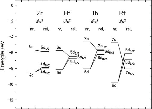 Für das erste Transactinidenelement mit der Kernladungszahl 104 (Rutherfordium, Rf) ist das Energieniveauschema in Abbildung 1 gezeigt. Relativistische Rechnung zeigen eine so große Absenkung des 7s-Orbitals und eine so große Anhebung des 6d-Orbitals, dass das 7s-Orbital energetisch unter den 6d-Orbitalen liegt. Nichtrelativistische Rechnungen geben diesen Trend nicht wieder. Bei den leichten Homologen Zr, Hf und dem Pseudohomologen[1] Th zeigen erwartungsgemäß die relativistischen Rechnungen keine so starken Veränderungen in der Elektronenkonfiguration.
