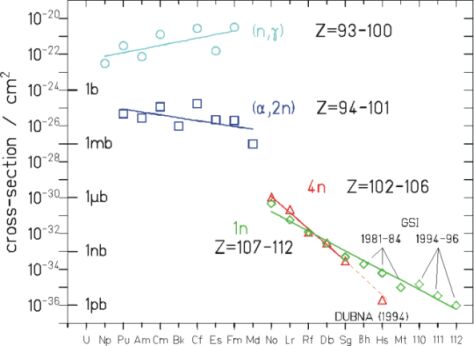Die Produktion schwerer Elemente in wägbaren Mengen durch Neutroneneinfang und anschließendem b--Zerfall endet beim Fermium-256, das ausschließlich durch Spontanspaltung zerfällt. Die Synthese schwererer Elemente gelingt nur noch in Reaktionen mit Schwerionen an Beschleunigern. Dabei müssen hochgeladene Projektile die Coulombabstoßung des Atomkerns überwinden, um zu fusionieren, was mit einem rapiden Abfall der Wirkungsquerschnitte (und damit der Produktionsraten) im Gegensatz zum Einfang eines ungeladen Neutrons durch den Atomkern einhergeht (Abbildung 2).